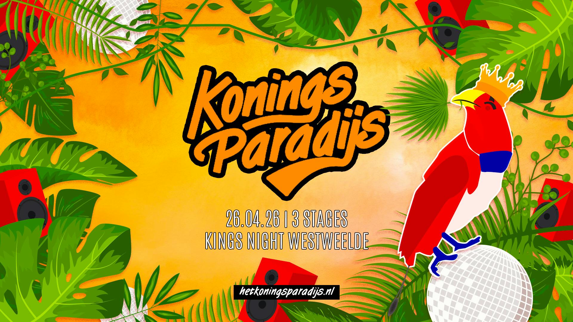 Het Koningsparadijs is dé Kings Night party van Amsterdam. Op 26 april 2026 transformeren we WestWeelde tot een tropisch paradijs waar je de verjaardag van de Koning viert met de beste beats, drie unieke stages en een onvergetelijke sfeer.